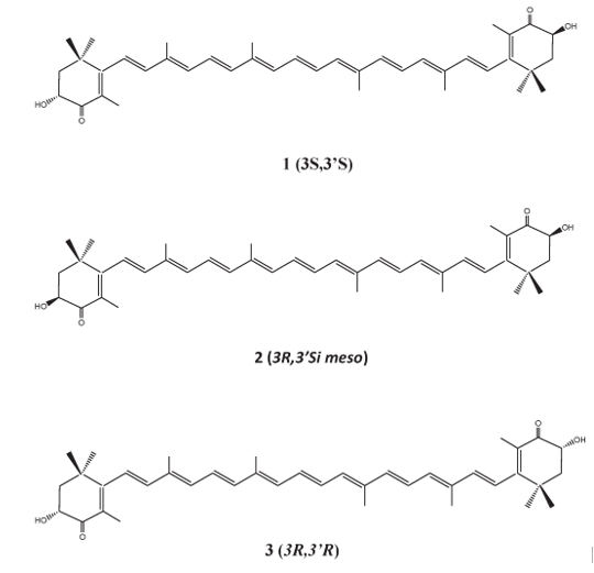 ASX có ba đồng phân: hai đồng phân đối quang (3R,3′R và 3S,3′S) và một dạng trung gian (3R,3′S). Tảo Haematococcus chủ yếu sản xuất đồng phân 3S,3′S, trong khi nhuyễn thể Nam Cực chủ yếu sản xuất đồng phân 3R,3′R