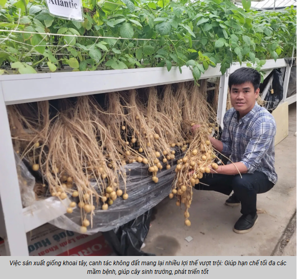 Theo PGS, TS. Nguyễn Xuân Trường, Viện trưởng Viện Sinh học và Công nghệ Nông nghiệp, trong sản xuất giống khoai tây, canh tác không đất mang lại nhiều lợi thế vượt trội. Trước hết, phương thức này giúp hạn chế tối đa các mầm bệnh tồn tại trong đất, nguyên nhân chính gây thoái hóa giống và suy giảm năng suất. Thứ hai, việc kiểm soát dinh dưỡng chính xác giúp cây sinh trưởng đồng đều, củ giống có kích thước, chất lượng ổn định, phù hợp cho sản xuất đại trà.