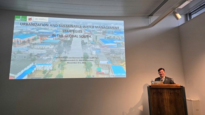 PGS.TS. Trần Trọng Phương (Trưởng khoa Tài nguyên và Môi trường) trình bày tham luận tại Hội thảo Quốc tế về quy hoạch sử dụng đất và biến đổi khí hậu tại Đại học LMU Munich-CHLB Đức (tháng 11/2024) |