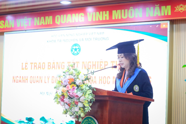 Thạc sĩ Trần Thị Diệu Linh – Sở Tài nguyên và Môi trường (nay là Sở Nông nghiệp và Môi trường) tỉnh Ninh Bình phát biểu tại buổi Lễ trao bằng tốt nghiệp Thạc sĩ (tháng 12/2022) |